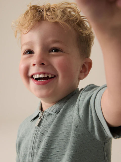 This sage green 2-piece set is perfect for sun-drenched occasions, featuring a cotton-rich polo shirt with a textured pattern and a zip neck with collar detailing, alongside a pair of matching pure-cotton shorts with an elasticated waistband.